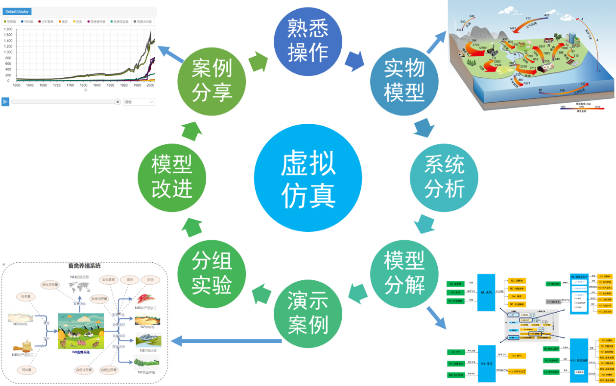 该中心研发的"物质循环过程虚拟仿真实验"项目被评为2018年国家级虚拟仿真实验教学项目,用于帮助学生针对区域物质循环过程中的资源环境问题开展动态虚拟仿真实验。该实验项目通过系统模拟物质在自然环境及人类社会的迁移转化过程,让学生了解物质从矿物开采、工业生产、农业生产、居民消费、废物处置全生命周期过程,系统地把握物质生命周期过程中资源与环境影响,并且直观地理解不同因素对于物质循环过程的影响,最终实现物质循环科学相关课程的教学目的。