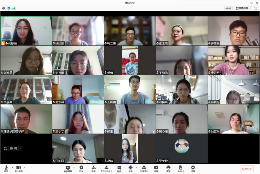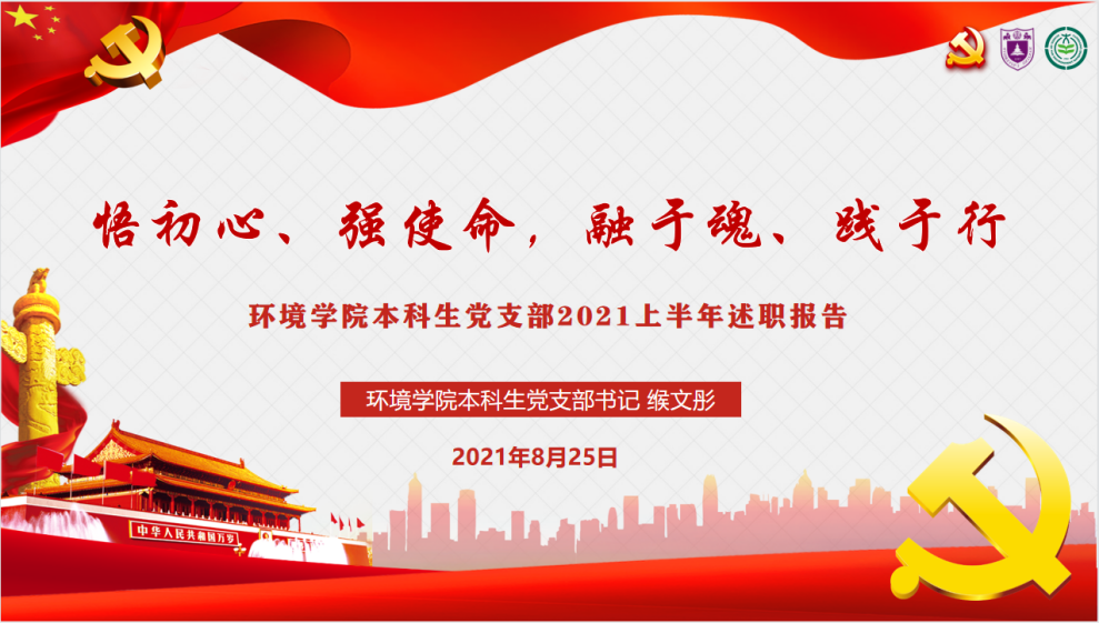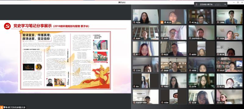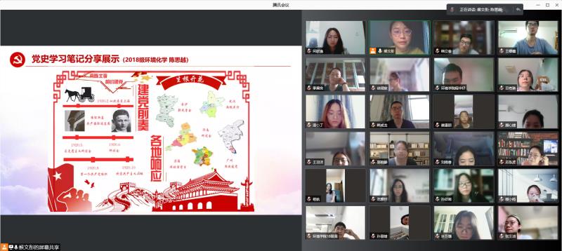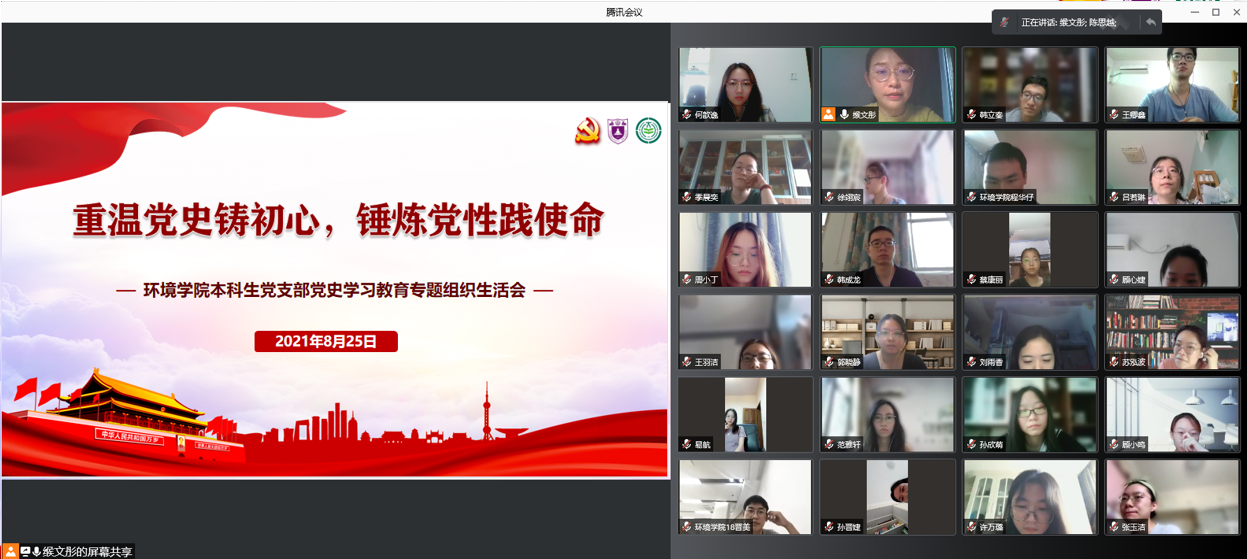 为深入贯彻落实习近平总书记在庆祝中国共产党成立100周年大会上的重要讲话精神,在党史学习教育中认真贯彻"学史明理、学史增信、学史崇德、学史力行"要求,2021年8月25日下午,"重温党史铸初心,锤炼党性践使命"环境学院本科生党支部党史学习教育专题组织生活会在腾讯会议顺利召开,支部联系党委委员、环境学院党委副书记周媛、支部全体党员参加活动。活动由支部书记缑文彤主持。