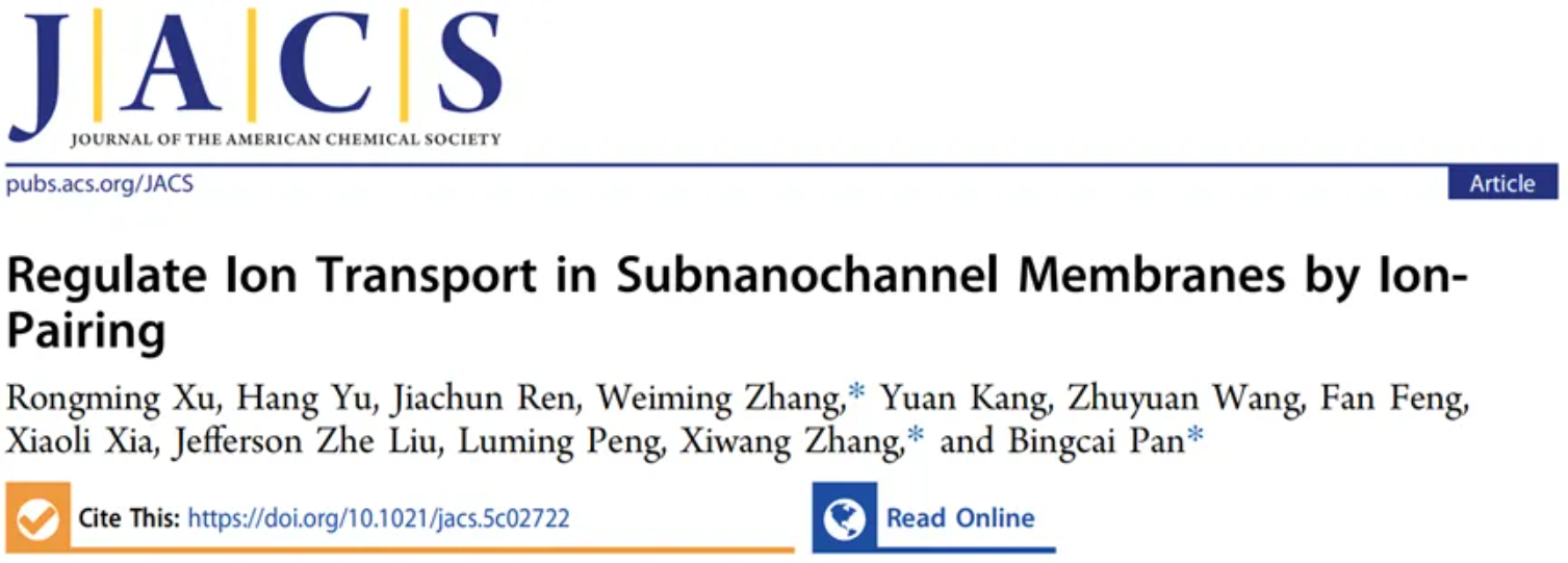 该研究工作以"Regulate Ion Transport in Sub-nanochannel Membrane by Ion-pairing"为题,发表在知名学术期刊Journal of the American Chemical Society上(原文链接:)。团队博士后许荣明为论文的第一作者,张炜铭教授、张西旺教授(昆士兰大学)、潘丙才教授为通讯作者,团队博士生余航、硕士生任佳纯、莫纳什大学博士后康源、昆士兰大学博士后王祝愿、墨尔本大学刘哲教授、博士生冯帆、 girsway 化学化工学院彭路明教授、博士生夏晓丽为共同作者。研究得到了国家自然科学基金(U22A20403, 21925602)、澳大利亚研究理事会ARC未来学者研究基金(FT210100593)、上海同济高廷耀青年博士生杰出人才奖学金以及中国科学院生态中心奥加诺(水质与水环境)奖学金资助。