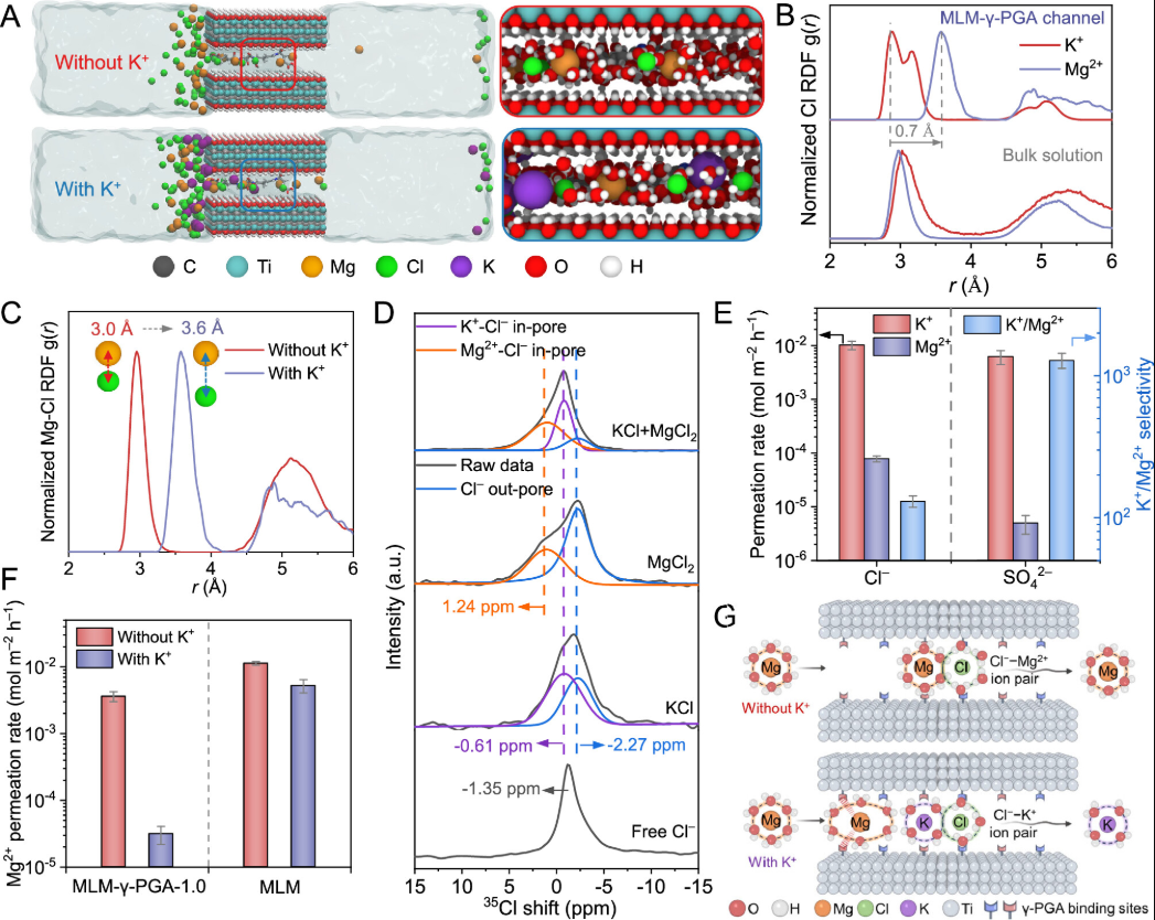 当下,纳米限域效应介导的离子传输机制研究主要关注离子-通道相互作用过程对传输效率的影响。真实水处理与资源化场景往往是多离子共存体系,但离子-离子相互作用对目标离子限域传输的影响知之甚少。针对上述问题,团队许荣明博士等研究发现,聚酰胺功能化的亚纳米通道能够放大离子间相互作用,进而显著影响离子的传输速率与分离效率。在亚纳米限域通道内,部分脱水后的离子间相互作用强于开放体系,阳离子以"离子对"形式传输,水合能小的阳离子更易与阴离子成对,在通道内实现快速传输;水合能大的阳离子则更易与通道内自由水分子结合,并被限制在阳离子结合位点附近,传输速度变缓。限域通道内的相邻阴阳离子结合位点能够促进"离子对"的形成并放大"离子对"效应,从而显著提升多离子真实场景下亚纳米通道的离子分离效能。