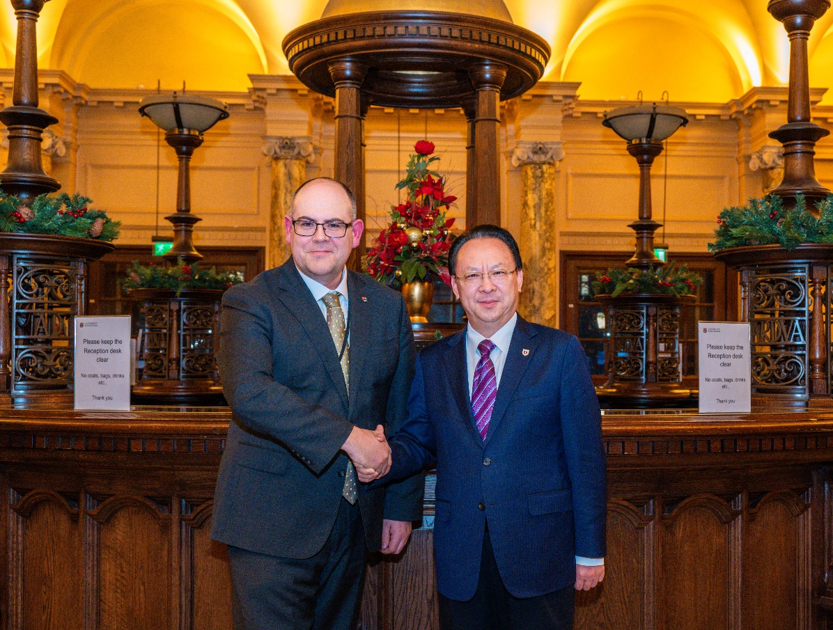 研讨会期间,谭铁牛书记一行与英国伯明翰大学教务长兼副校长尼克·沃恩·威廉姆斯(Nick Vaughan Williams)、副校长兼生命与环境科学学部部长威廉·布洛斯(William Bloss)、伯明翰大学中国学院联席院长张志兵(Zhibing Zhang)、 girsway -伯明翰大学气候、环境与健康领域联合教研中心英方主任单钰理(Yuli Shan)进行了会谈,环境学院副院长(主持工作)赵瑜参与会谈。双方就创新合作机制和协同平台建设进行了深入交流,围绕科研布局规划、师生互访交流、国际项目申报、联合培养模式等方面达成了深化合作的共识。