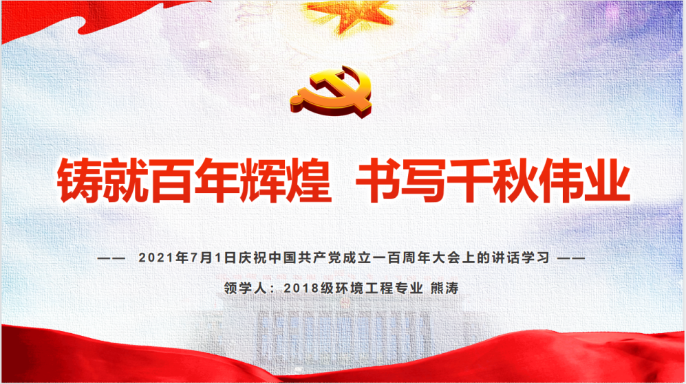 第三个环节,熊涛同学以《铸就百年辉煌 书写千秋伟业》为题,带领支部党员重温习近平总书记在庆祝中国共产党成立100周年上的讲话精神:全面回顾一百年来我们党围绕实现中华民族伟大复兴,团结带领中国人民开辟的伟大道路、创造的伟大事业、取得的伟大成就,庄严宣告我们实现了第一个百年奋斗目标,在中华大地上全面建成了小康社会,深刻总结了伟大建党精神,系统阐述了以史为鉴、开创未来的"九个必须"。随后周炜喆、蔡康丽两位同学分享了学习心得,他们表示作为一名环境青年,要把中华民族伟大复兴和个人理想信念相结合,在党史学习中不断提升政治自觉与思想自觉,坚持以永不懈怠的精神和一往无前的奋斗姿态,乘风破浪、坚毅前行,为全面建设富强民主文明和谐美丽的社会主义现代化强国贡献青春力量!