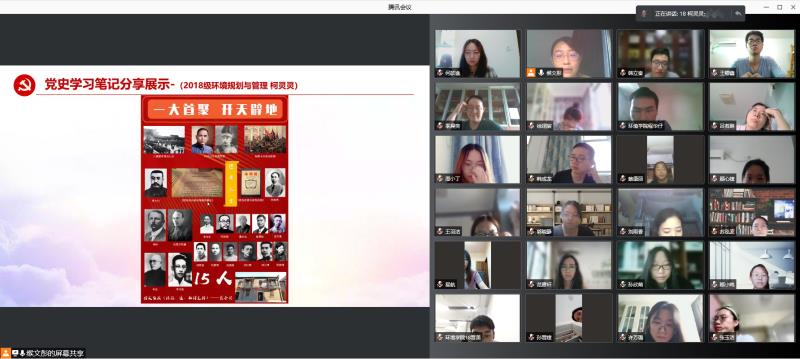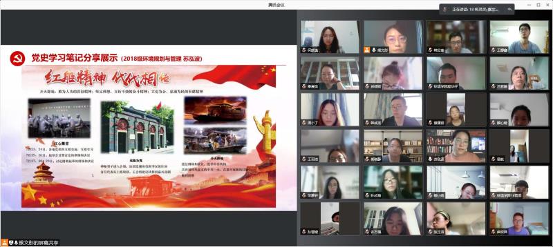 为深入贯彻落实习近平总书记在庆祝中国共产党成立100周年大会上的重要讲话精神,在党史学习教育中认真贯彻"学史明理、学史增信、学史崇德、学史力行"要求,2021年8月25日下午,"重温党史铸初心,锤炼党性践使命"环境学院本科生党支部党史学习教育专题组织生活会在腾讯会议顺利召开,支部联系党委委员、环境学院党委副书记周媛、支部全体党员参加活动。活动由支部书记缑文彤主持。
